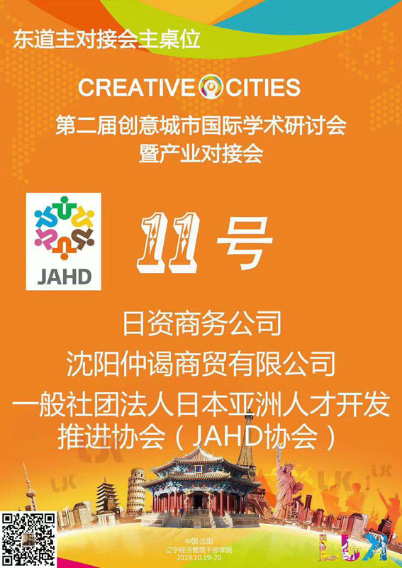 由辽宁大学民建联合研究院、辽宁经济管理干部学院(辽宁经济职业技术学院)联合举办的第二届创意城市国际学术研讨会暨产业对接会将于10月18~20日在沈阳召开。届时,JAHD协会将作为平台方,在东道主对接会主桌位11号等待您的到来。